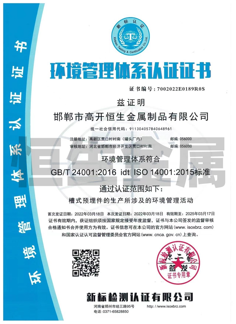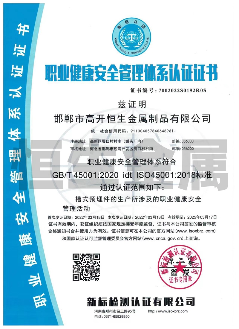 邯鄲市高開恒生金屬制品有限公司總部設在鋼城河北邯鄲,西鄰京廣線、東臨京深高速,地理位置優越,交通比較便利。 我廠擁有多年生產預埋槽道的產品生產經驗,專業生產鍍鋅防腐槽型預埋件系列產品,其中產品包括:高開恒生哈芬槽、哈芬槽鋼、預埋槽道、預埋滑槽、帶齒預埋槽鋼、槽式預埋件、工字鋼材料、C型槽材料配套的T型螺栓,也可根據客戶需求按圖訂做加工,產品廣泛應用于隧道、城市軌道交通、地下綜合管廊、建筑幕墻施工工程。